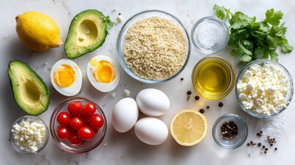 These ingredients harmonize brilliantly: nutty quinoa forms a hearty base, soft-boiled eggs add creamy protein, avocado brings silky fats, cherry tomatoes offer juicy pops of acidity, feta delivers tangy saltiness, olive oil and lemon juice tie it with bright freshness, and herbs garnish with garden vibrancy. Together, they create balanced, craveable bliss.