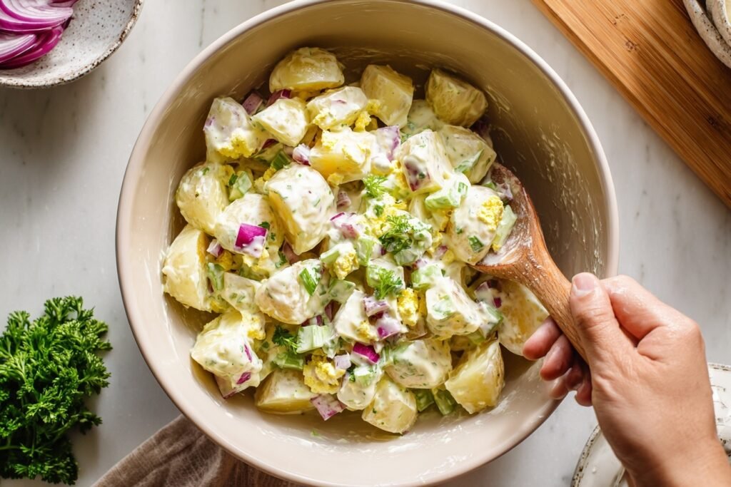 5. Gently fold cooled potatoes into the dressing. Use a rubber spatula to coat evenly without mashing—aim for intact cubes glistening with sauce.