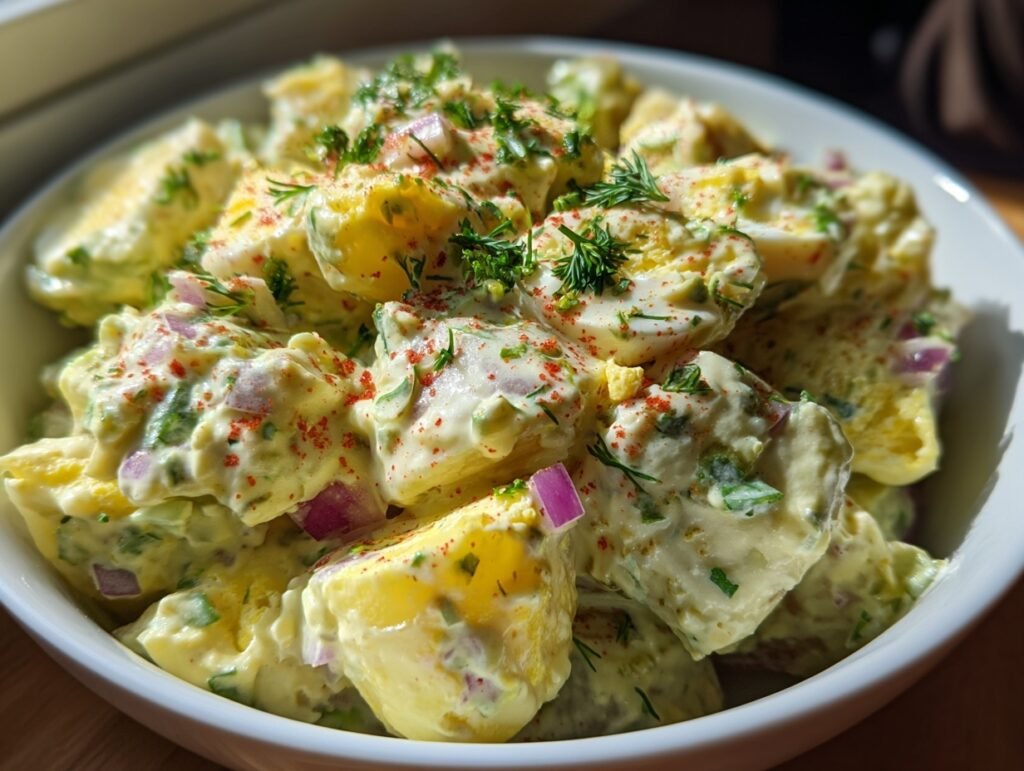 Imagine scooping into a chilled bowl of Classic Potato Salad, where creamy mayonnaise swirls with zesty mustard, embracing tender potato cubes that glisten under a sprinkle of vibrant paprika. The aroma wafts up—fresh parsley mingling with tangy dill pickle relish and a whisper of apple cider vinegar, promising that perfect balance of cool crunch from celery and red onion against the soft, comforting bite of hard-boiled eggs. One taste explodes with nostalgia: savory, slightly sweet, and irresistibly picnic-ready, evoking lazy summer afternoons and backyard barbecues.