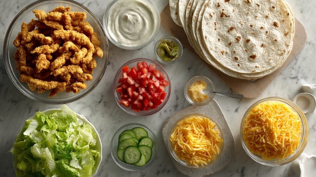 Fresh, crisp produce and indulgent creamy ranch create a perfect balance for these wraps. The shredded cheddar melts into pockets of richness while the cucumbers and lettuce add lift and crunch. Using cooked crispy chicken strips keeps prep short and keeps the wrap satisfyingly substantial. Below are the precise amounts and a few simple swaps to customize.