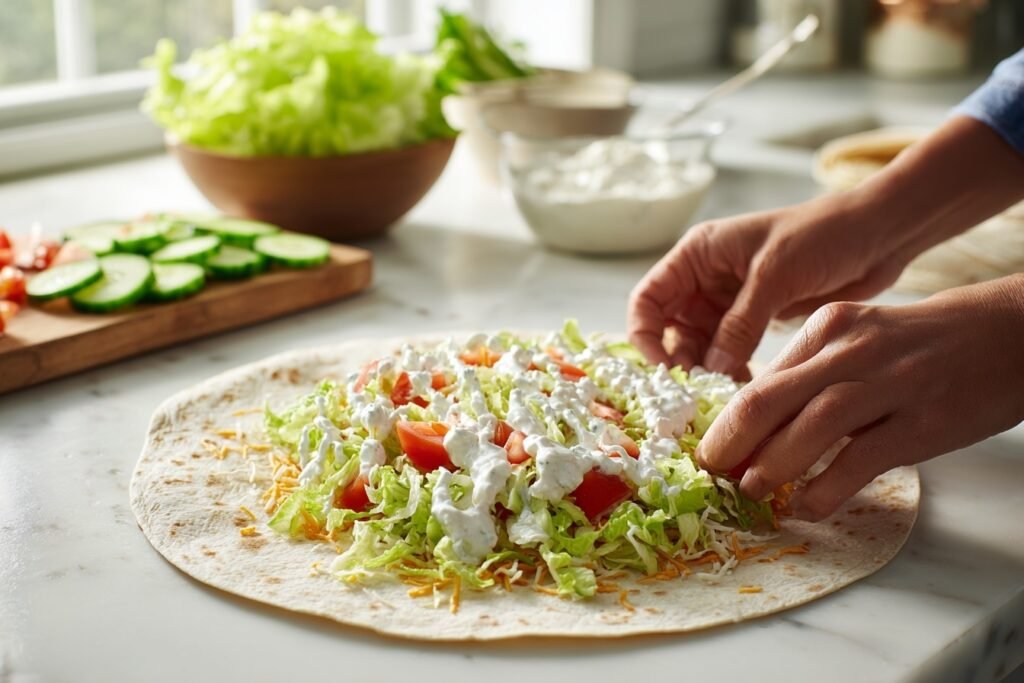 7. Top with a thin layer of chopped lettuce, diced tomatoes, and sliced cucumbers for contrast. Keep fillings centered for neat folding.
