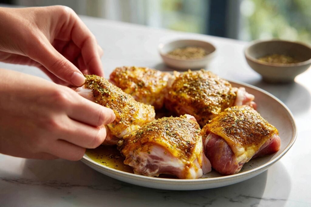 These simple pantry staples create harmony: olive oil locks in moisture for ultra-crispy skin, while garlic powder, onion powder, paprika, thyme, salt, pepper, and optional cayenne build layers of smoky, aromatic flavor. Bone-in skin-on thighs ensure succulence, making every bite a textural dream.