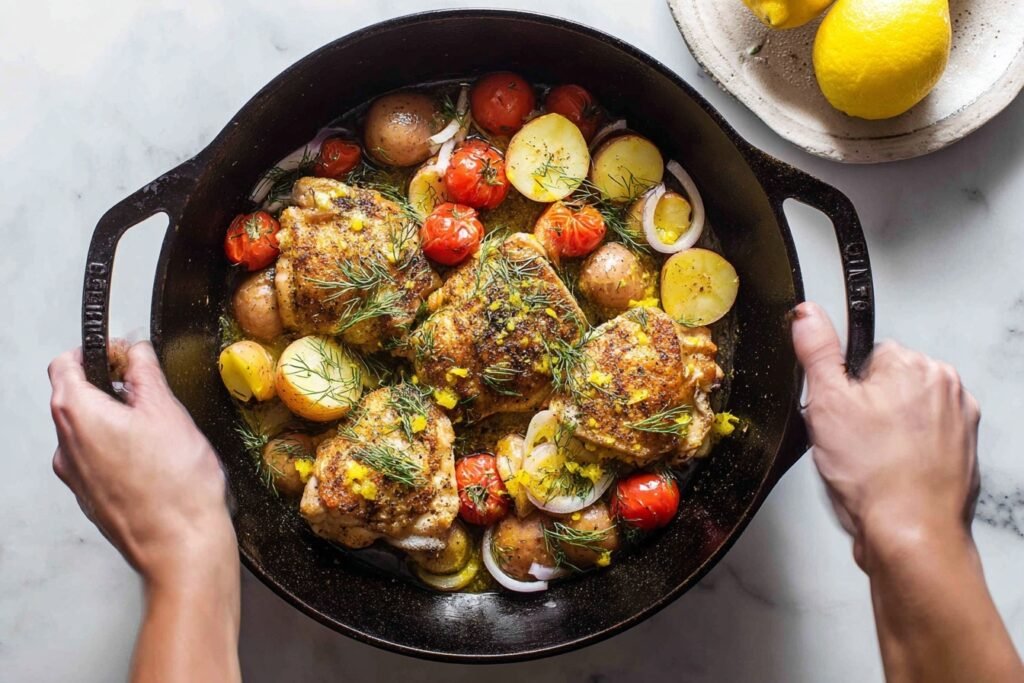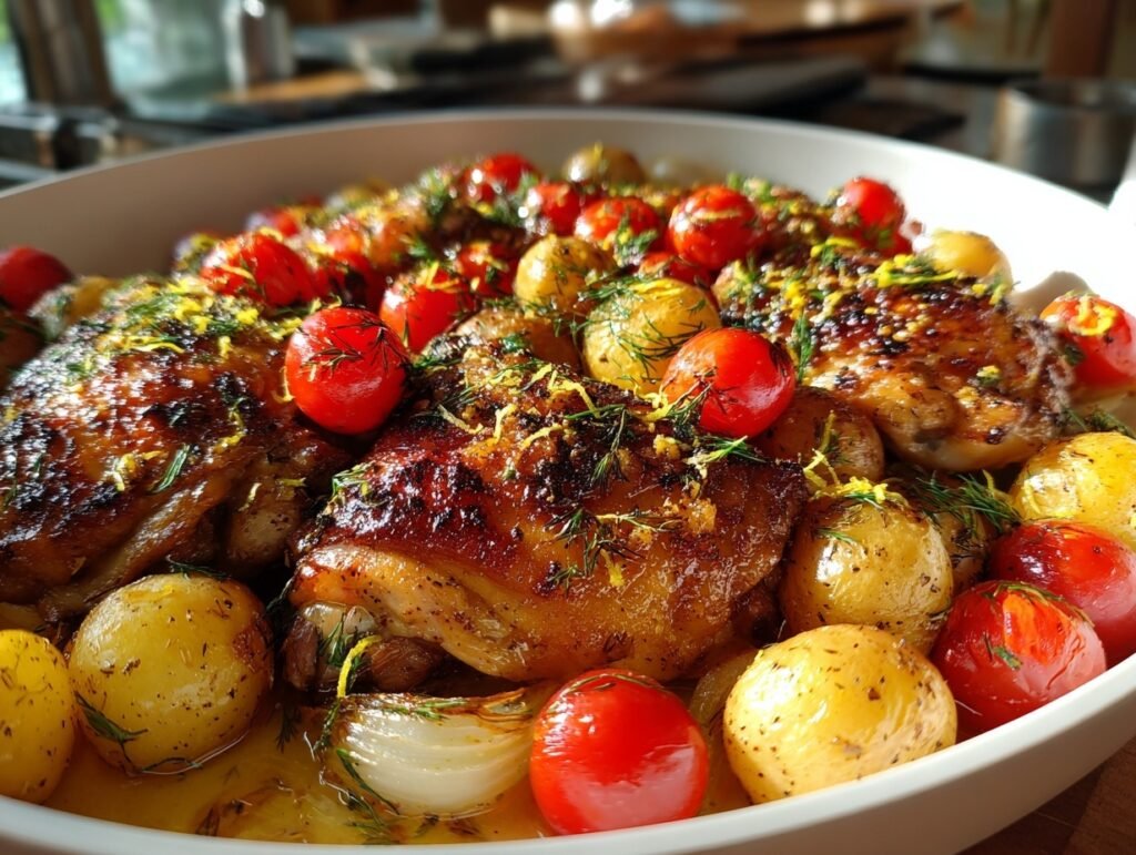 Imagine the sizzle of golden chicken thighs hitting a hot skillet, releasing an intoxicating aroma of fresh lemon zest and fragrant dill that fills your kitchen like a Mediterranean breeze. Crispy skins crackle with every bite, giving way to juicy, tender meat bursting with bright citrus tang and herby freshness. Halved baby potatoes soak up the savory pan juices, while cherry tomatoes burst into sweet, juicy pops of red, mingling with caramelized onions for a one-pan masterpiece that’s as visually stunning as it is crave-worthy. This One-Pan Lemon Dill Chicken Thighs — Easy 30-Minute Skillet Dinner isn’t just food; it’s a golden-hued, herb-flecked dream that photographs like a Pinterest pin ready to go viral.