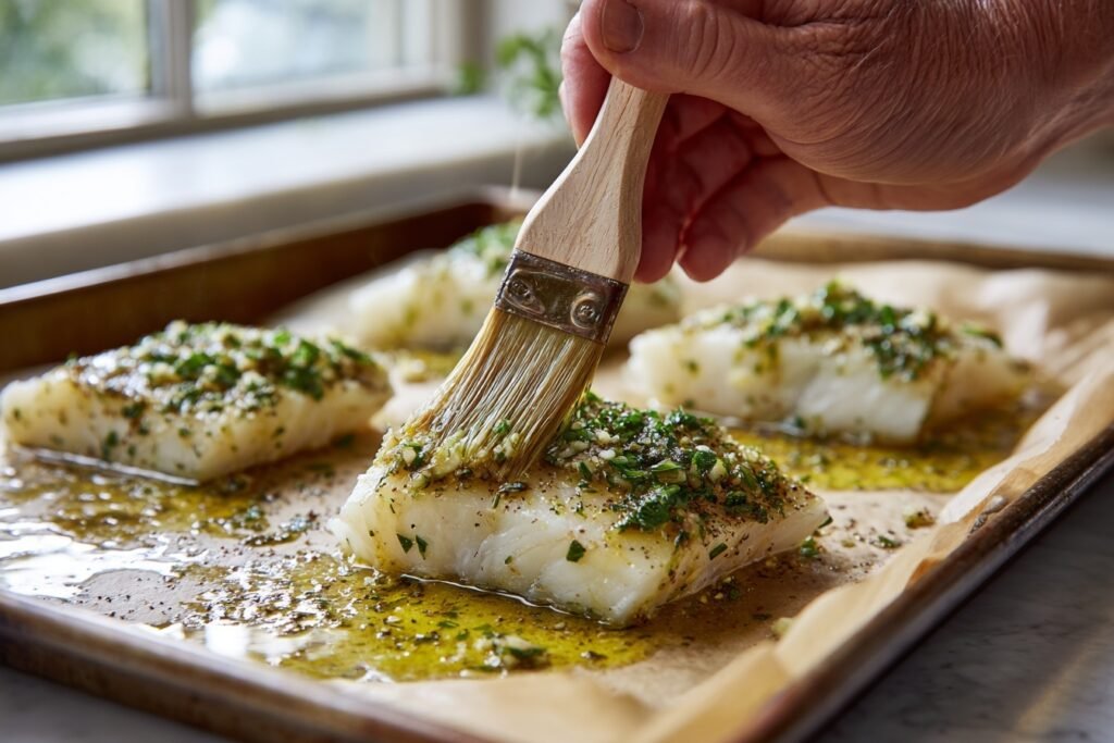 4. Place the cod fillets on the prepared baking sheet, skin-side down if applicable. Spoon the herb-oil mixture evenly over each fillet, ensuring full coverage for maximum flavor infusion.