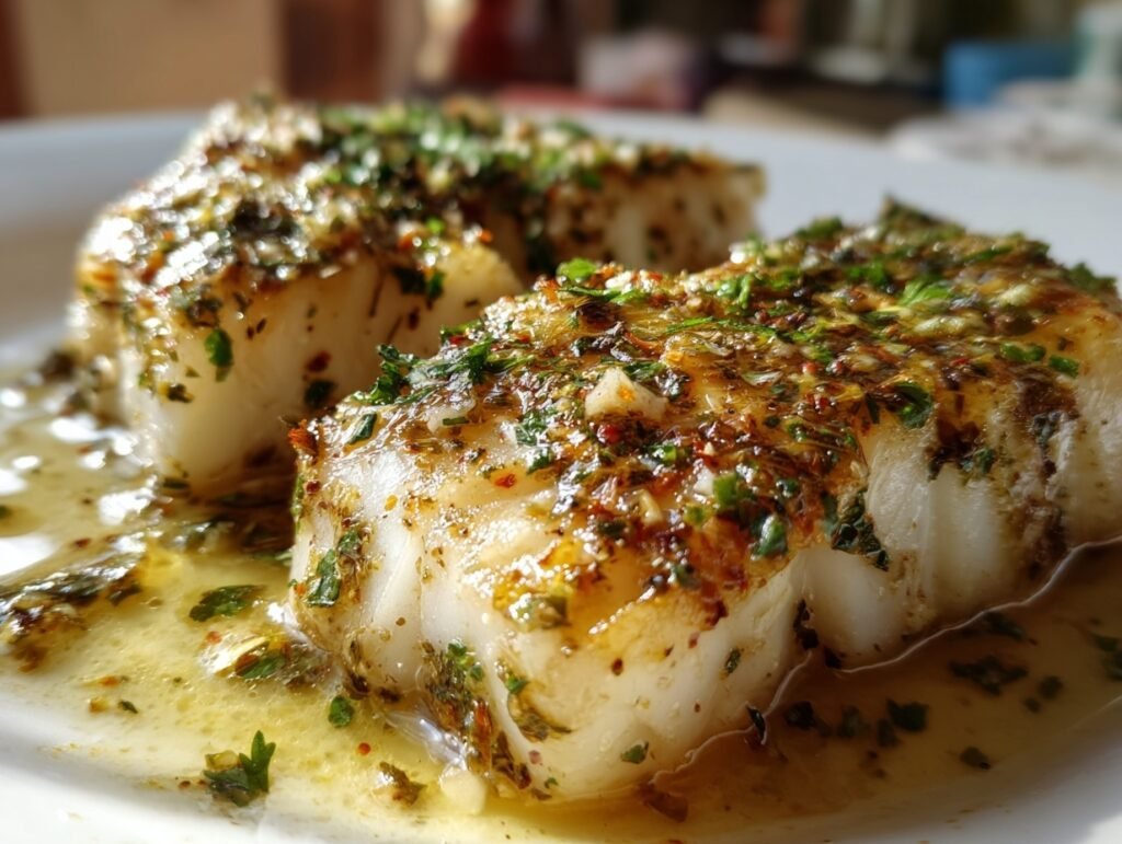 9. Transfer to plates immediately. The Easy Baked Cod with Herbs is ready to serve hot, with juices pooling beautifully.