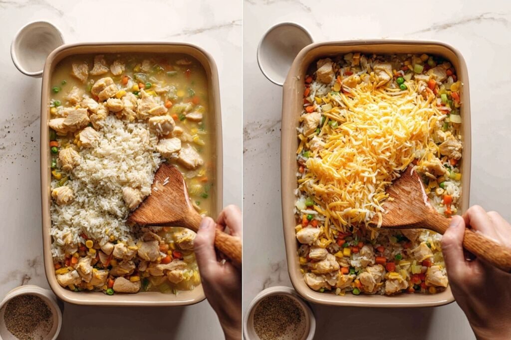 6. Combine everything: In the greased baking dish, layer cooked rice, sautéed chicken-onion mixture, and frozen mixed vegetables. Pour soup mixture evenly over top, gently stirring to coat everything without compacting.