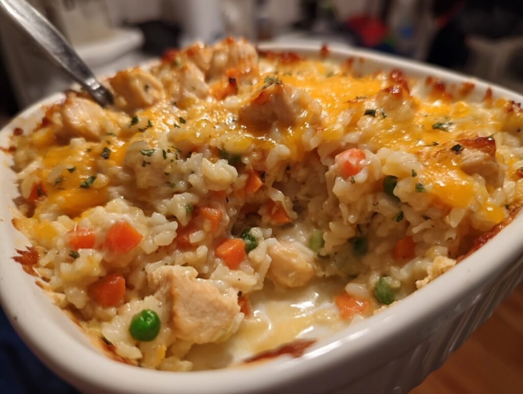 Imagine pulling a golden, bubbly Chicken and Rice Casserole from the oven, where tender chicken bites nestle into creamy rice studded with vibrant frozen veggies, all blanketed in melted cheddar that stretches like golden threads. The aroma hits first—rich, savory notes of garlic, onion, and paprika swirling with the comforting hug of cream soups and broth, making your kitchen feel like home. One bite delivers creamy bliss, fluffy rice soaking up every flavorful drop, with pops of color and crunch from the veggies. It’s pure comfort food magic that warms your soul on chilly evenings or wows at family gatherings.