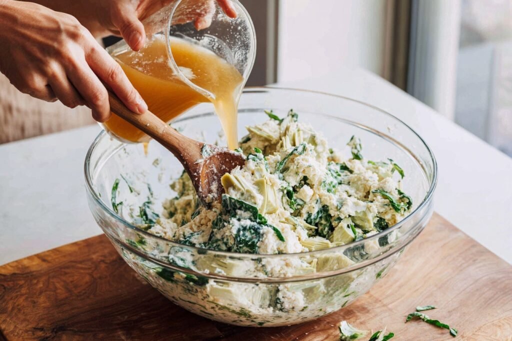 5. Add veggies and cheeses: Mix in chopped artichoke hearts and spinach. Cook 2-3 minutes until spinach wilts and softens. Stir in Parmesan, mozzarella, and remaining Italian seasoning until cheeses begin to melt, creating a gooey mixture.