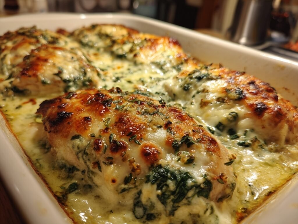 Imagine pulling a golden, bubbly tray of Spinach Artichoke Chicken from the oven, where tender chicken breasts nestle in a velvety cream sauce swirling with vibrant green spinach and plump artichoke chunks. The aroma hits first—garlicky warmth mingled with cheesy richness and a whisper of Italian herbs, making your kitchen feel like a cozy Italian trattoria. One bite delivers creamy bliss: the subtle tang of artichokes cutting through melted mozzarella and Parmesan, all hugging juicy chicken that melts in your mouth. This Spinach Artichoke Chicken isn’t just dinner; it’s pure comfort that looks magazine-worthy, with its glossy topping begging to be photographed.