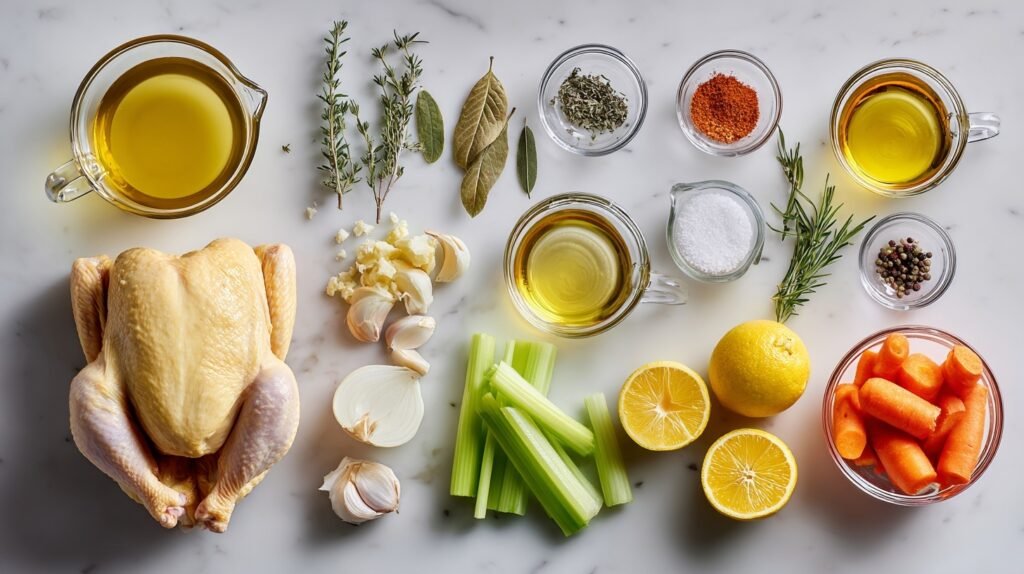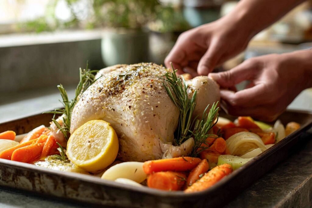 These ingredients harmonize beautifully: olive oil locks in moisture for crispy skin, while garlic, thyme, rosemary, paprika, salt, and pepper create a robust herb crust. Lemon and onion infuse juicy brightness from inside, and carrots with celery add sweet, tender crunch alongside broth for a flavorful base that steams everything to perfection.