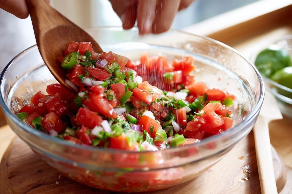 2. Chop the onion and peppers: Finely chop 1 small red onion and mince 2 seeded jalapeños. Add to the tomato bowl. The onion’s crisp purple bits and green pepper flecks create visual pop and balanced heat.