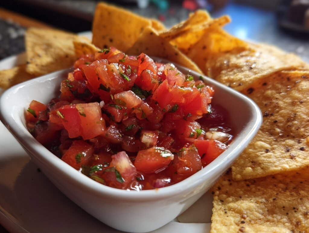 Fresh Tomato Salsa & Homemade Tortilla Chips packs antioxidants from tomatoes and vitamin C from limes and peppers, supporting immunity and skin glow. Cilantro aids detox, while olive oil’s healthy fats promote heart health. Corn tortillas offer whole-grain fiber for steady energy.
