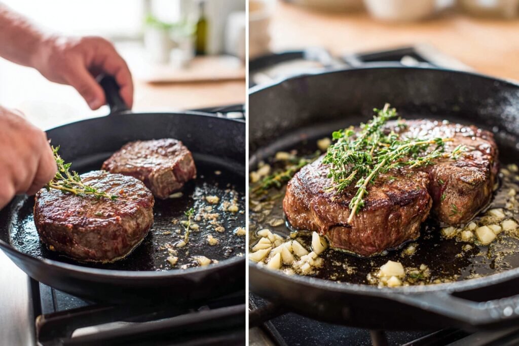 Place a large cast-iron or stainless steel skillet over medium-high heat. Let it heat for 1-2 minutes until it’s properly hot. You want the pan hot enough that a drop of water sizzles immediately—this ensures proper browning and that coveted crust on your beef.