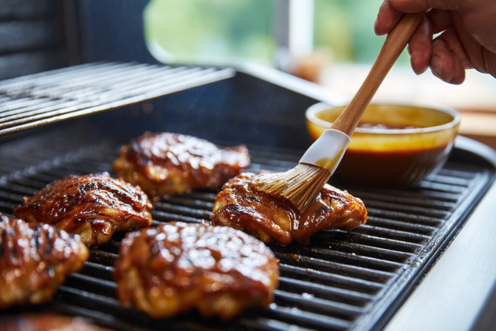 8. In the last 2 minutes of grilling, brush chicken generously with glaze on both sides. Flip once more for even shine. Thighs are done when juices run clear and edges caramelize.