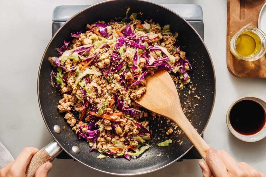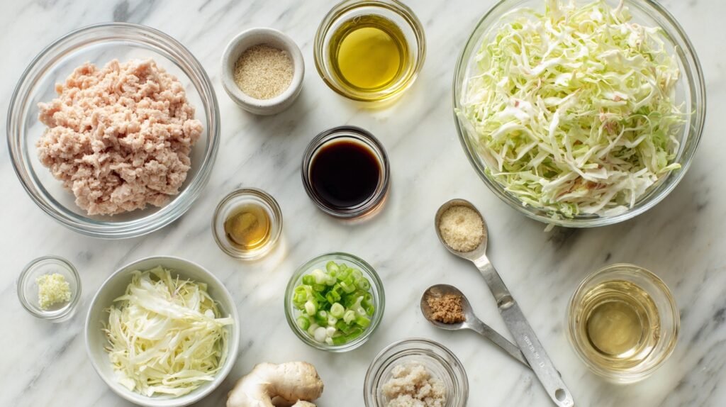 These simple, fresh ingredients sing together: juicy ground chicken provides savory depth, crisp coleslaw mix offers contrasting crunch when lightly wilted, and the aromatics—garlic and ginger—brighten every bite. Sesame oil gives a nutty warmth, while soy sauce and rice vinegar balance sweet and tangy notes. Green onions finish it with a peppery, fresh pop that adds a beautiful color contrast.