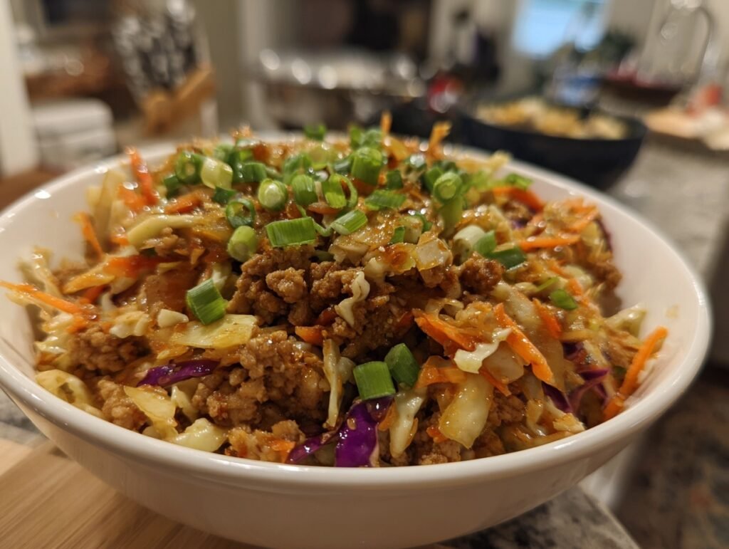 The sizzle is the first promise: savory ground chicken hitting a hot skillet and releasing a warm, toasty aroma of sesame and ginger that fills the kitchen. Bright ribbons of coleslaw mix soften into tender bites, flecked with vibrant green onions, and a glossy soy-sesame glaze coats every strand. Each forkful of Easy Egg Roll in a Bowl gives you the crunchy, familiar comfort of an egg roll—without the wrapper—balanced by a tang of rice vinegar and the gentle heat of garlic and ginger. It’s a weeknight miracle that looks gorgeous in a shallow bowl, steaming and fragrant, ready for photos that practically beg to be pinned.