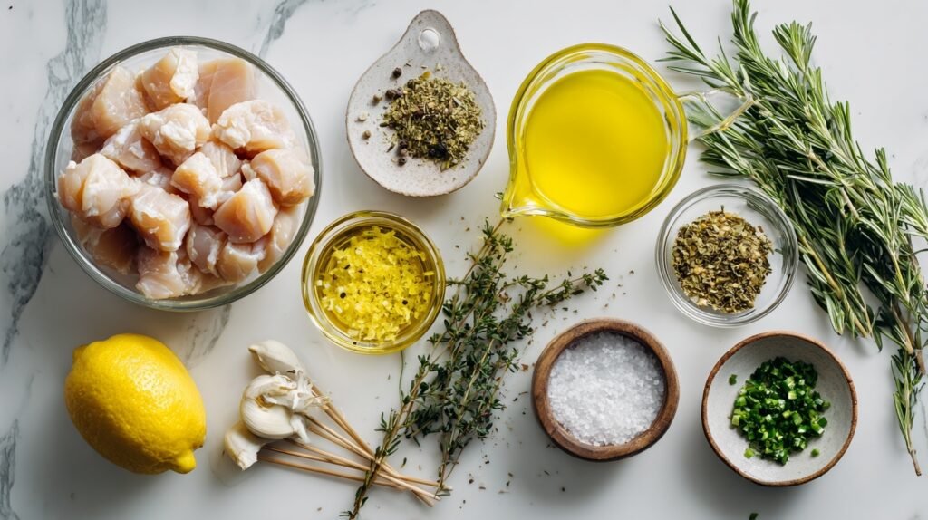 These simple, fresh ingredients harmonize beautifully: tart lemon juice tenderizes and brightens the chicken, while olive oil keeps it moist. Robust garlic, rosemary, thyme, and oregano create a Mediterranean herb symphony, with zest adding floral notes. Salt and pepper enhance every bite—pure, vibrant synergy for juicy, aromatic skewers.
