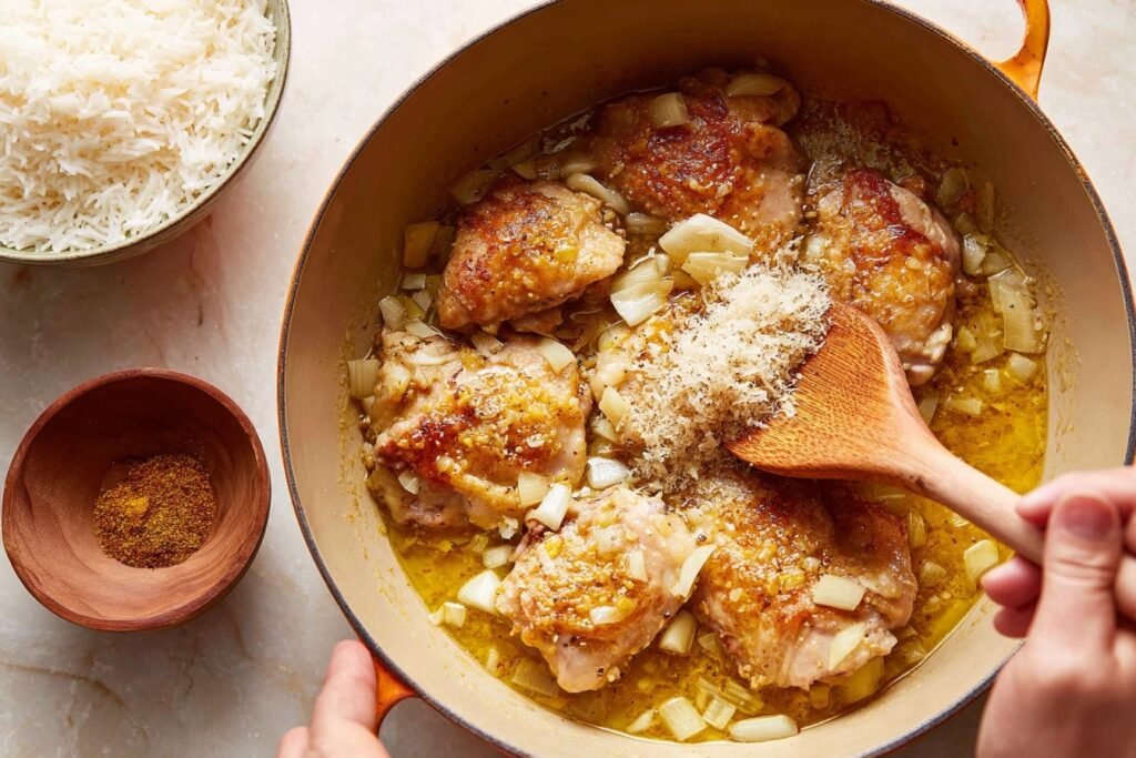 These ingredients harmonize beautifully in Stick of Butter Chicken and Rice—the butter melts into a luxurious base, spices like cumin and garam masala build deep, aromatic layers, while chicken thighs stay juicy in the creamy tomato-broth sauce. Basmati rice soaks it all up for fluffy perfection, balanced by fresh cilantro and lemon zing.