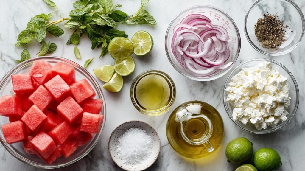 These ingredients in Watermelon Feta Salad create magic: watermelon’s juicy sweetness balances feta’s salty creaminess, while mint adds aromatic freshness and onion brings crisp bite. Lime juice and olive oil tie it with zingy brightness, making every element pop in harmony for a refreshing, addictive bite.