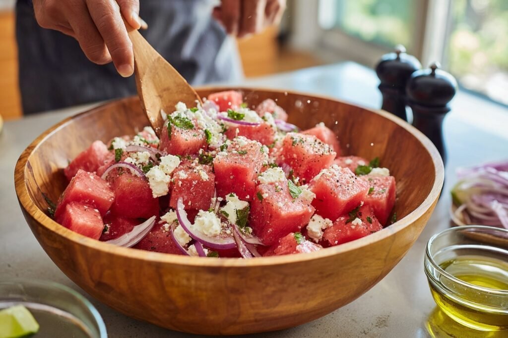 6. Assemble in a large bowl: Gently toss watermelon cubes with sliced onion and chopped mint. Drizzle half the dressing over top—watch the lime juice sparkle on the fruit’s surface.