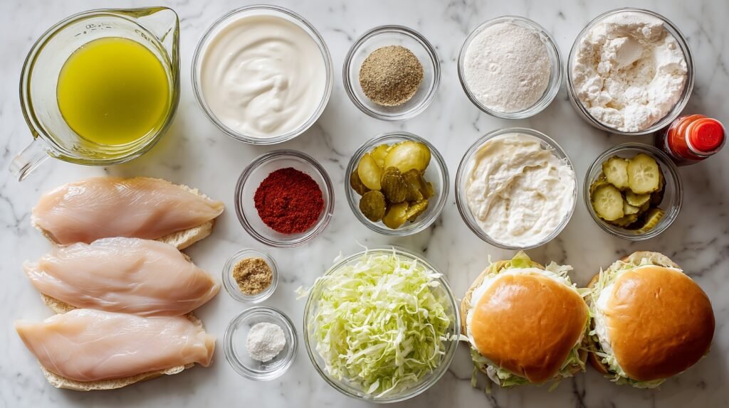 These ingredients harmonize brilliantly: pickle juice and buttermilk brine the chicken for supreme tenderness and subtle tang, while the spiced flour blend delivers smoky, spicy crispiness. Fresh lettuce and pickles add crunch and brightness, mayo-hot sauce ties it with creamy heat, and brioche buns provide pillowy perfection—every element elevates the Pickle-Brined Crispy Chicken Sandwich to crave status.