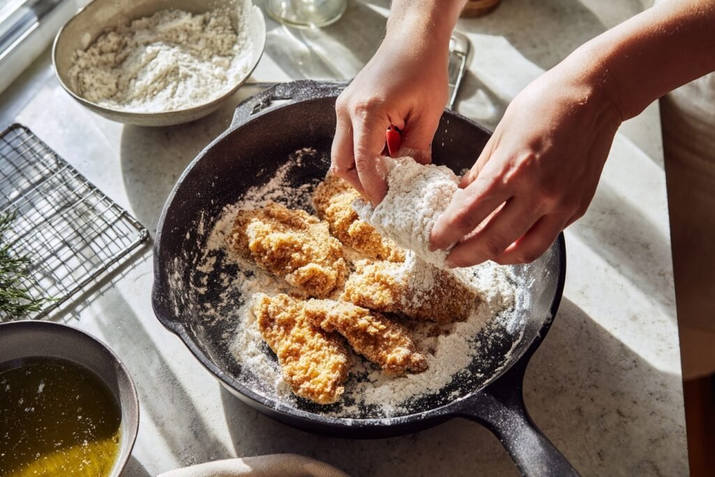 3. Double-dredge for extra crunch: Dip back in brine, then flour again before resting. This builds a shatteringly crisp shell.