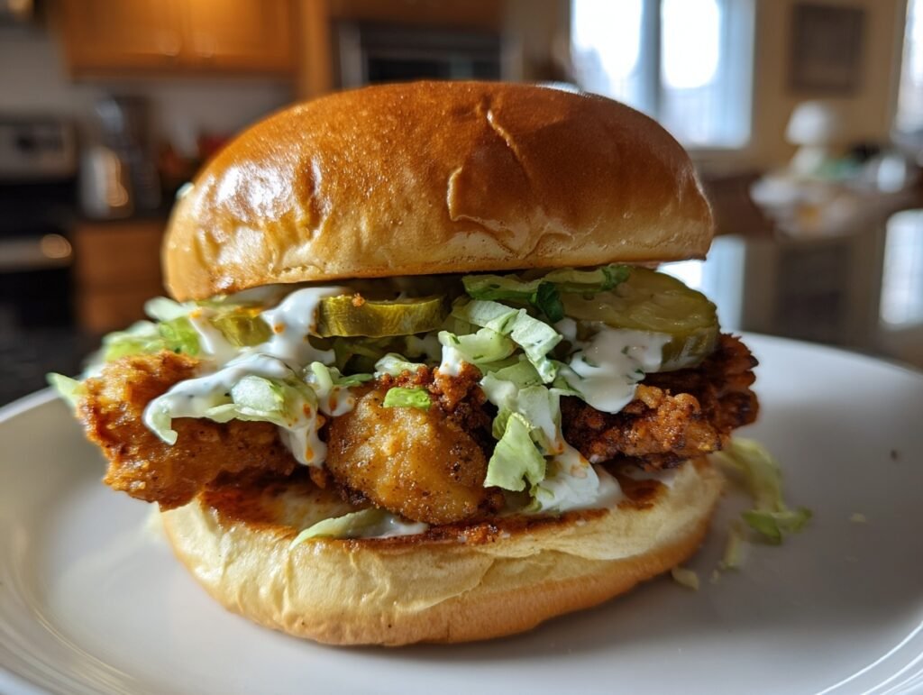 For longer storage, freeze breaded, fried chicken (pre-assembly) in airtight bags up to 2 months. Thaw overnight in fridge, then reheat in a 375°F oven for 10-12 minutes until hot and crispy—avoid microwave sogginess. Buns freeze separately; toast fresh. Quick air-fryer revival at 360°F for 4 minutes restores golden perfection every time.