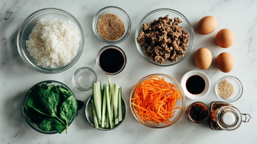 Each ingredient in this Easy Bibimbap with Ground Beef plays a clear role: cooked rice gives a soft, comforting base; ground beef adds savory richness; assorted vegetables bring crunch, color, and freshness; eggs add silkiness; sesame oil and soy sauce provide that classic Korean-inspired aroma; gochujang adds a focused hit of chili-fermented sweetness. Sesame seeds finish with a light toasty crunch.