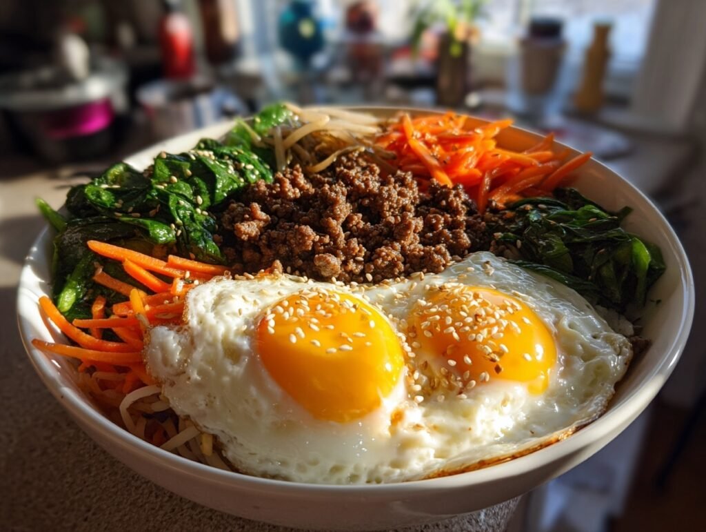 You’re about to build a bowl that dazzles. Work through the steps calmly: prep the veg, sear the beef until golden, sauté each vegetable so it retains vibrancy, and fry the eggs to your preferred doneness. Assemble the Easy Bibimbap with Ground Beef with intention—arrange, drizzle, and sprinkle for maximum appeal.