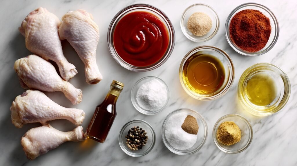 These ingredients harmonize perfectly for BBQ Baked Chicken Drumsticks: ketchup and honey create a sticky-sweet base, balanced by apple cider vinegar’s tang and Worcestershire’s umami depth. Spices like smoked paprika and chili powder infuse authentic barbecue smokiness, while garlic and onion powders amplify savoriness without fresh chopping.